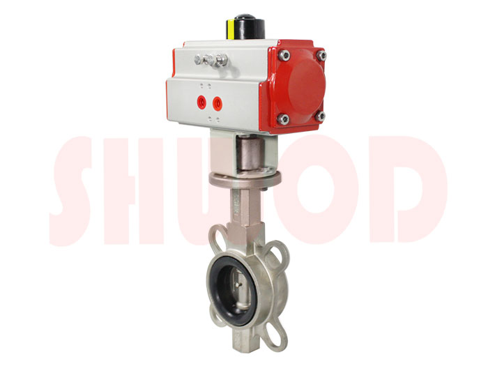 氣動對夾蝶閥是以壓縮空氣0.4-0.7MPa的氣源為動力,驅動閥杆帶動帶碟板在閥體內做0-90度的旋轉,達到對蝶閥全開和全關的操作控製。氣動對夾蝶閥可根據工況要求,對執行器裝配閥門定位器,輸入4-20mA的相關信號,從而控製蝶閥碟板的開度大小,實現對管道中介質的壓力、流量、溫度、液位等參數的百分比精準調節。氣動對夾蝶閥不僅可用於工業自動控製係統中作就地控製,也可進行遠距離集中控製,是工業管道中應用優先選用的係統裝置之一。